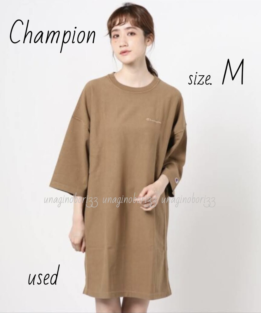 - Champion 7分袖ワンピース モカ M ゆったりめ チャンピオン 半袖 ロゴ刺繍 レディース女性 リバースウィーブ 色落ち 風合い古着 スウェット