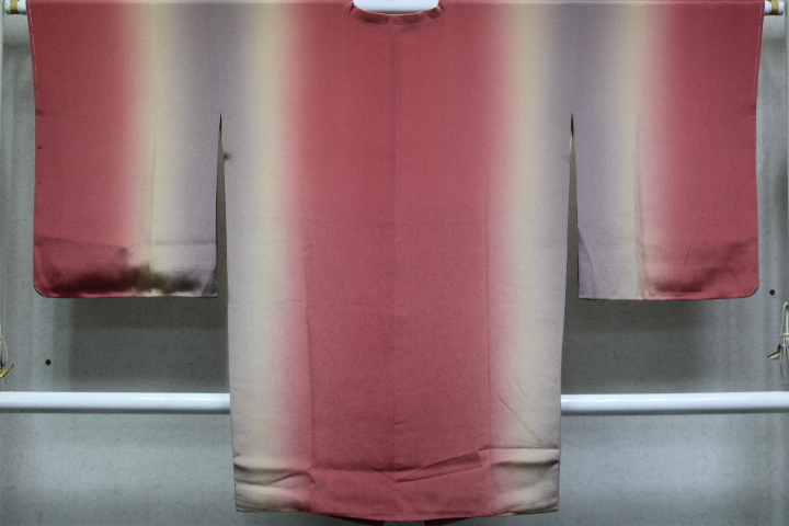 - きもの今昔8417 道行きコート 高級一越ちりめん地左右ボカシ染 ローズ色と藤色縦ぼかし シツケ付き未使用品