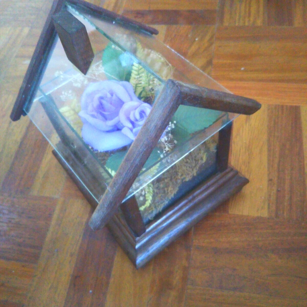 - 昭和レア物手作りアートガラスハウス型バラ造花オシャレ花飾り 置物飾り品 オブジェ