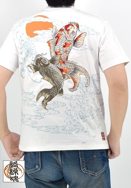 - 双鯉半袖Tシャツ◆絡繰魂 ホワイトXLサイズ 252032 和柄 和風 刺繍 コイ からくり