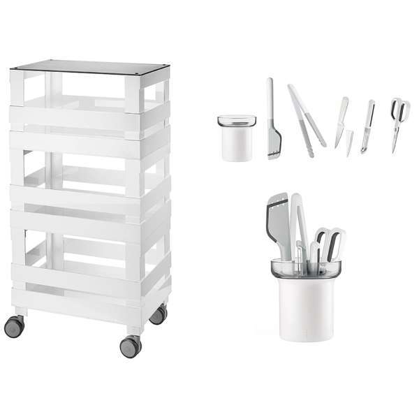 > ②【新品未使用品】グッチーニ|GUZZINI チョッピングボード付きキッチントロリー3段&キッチンツール 5P TIDY&STORE ホワイト 87852