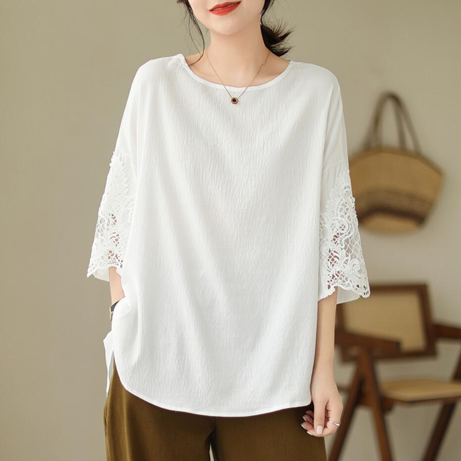 - 新入荷* チュニック 大きいサイズ ゆったり ブラウスシャツ 可愛い 大人 レース切り替え 無地 半袖 * 白