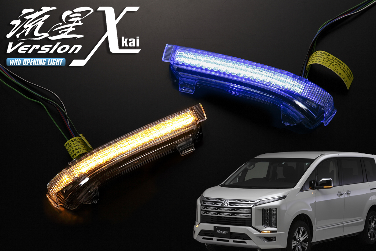 > 流星バージョンχ CV1W デリカD:5 (2019年2月~) LEDウインカーミラーレンズKIT 青光 オープニングライト搭載 ドアミラー シーケンシャル