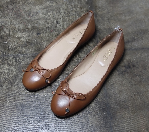 - TK 百貨店購入 新品 ラルフローレン LAUREN RALPH LAUREN ロゴ入りチャーム付 フラット リボンパンプス 7B ライトブラウン