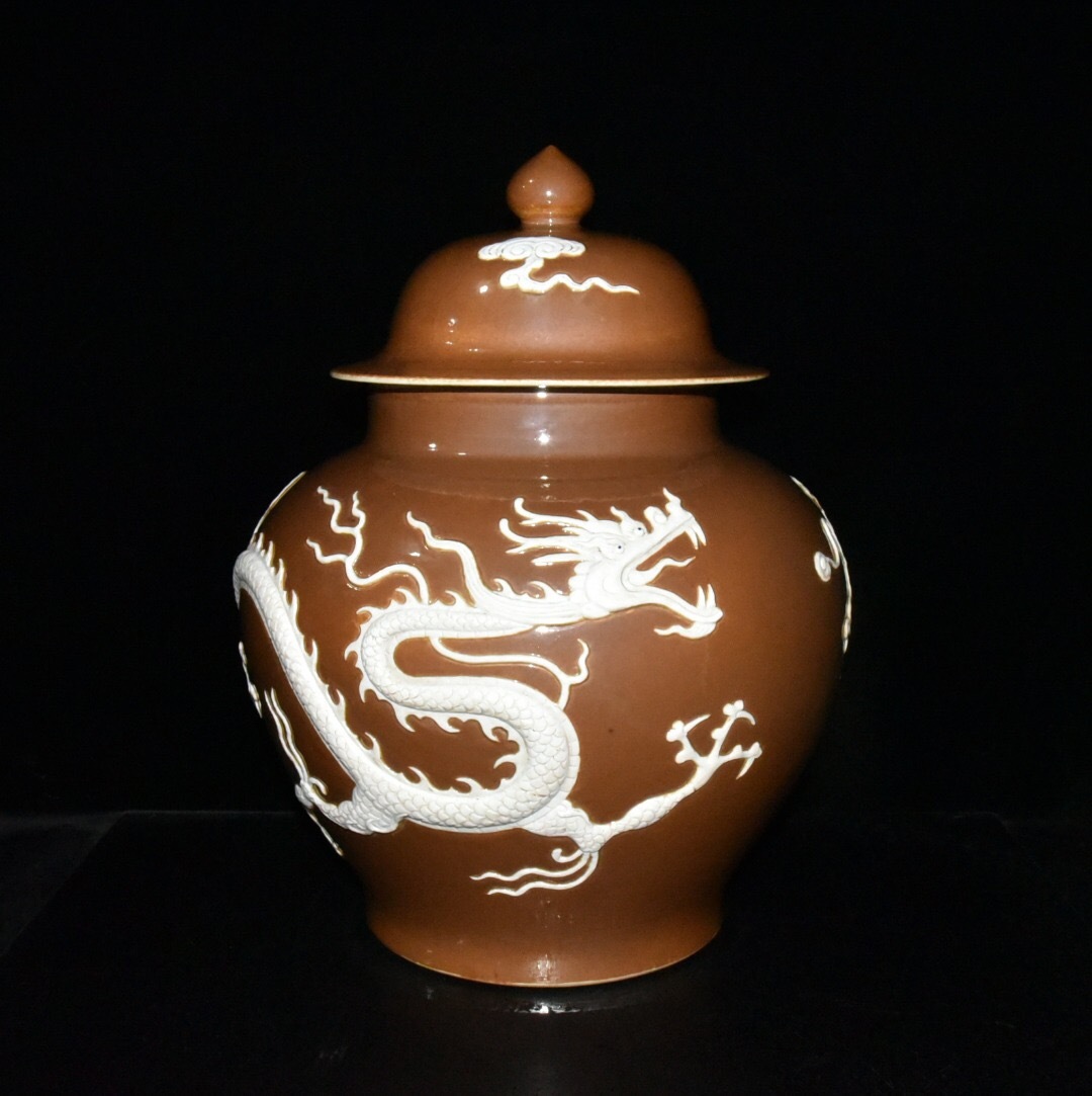 - 【超珍館蔵】元 古陶瓷品 祭黄釉 留白 龍紋 蓋罐 置物 古賞物 古美術品 稀少珍蔵品