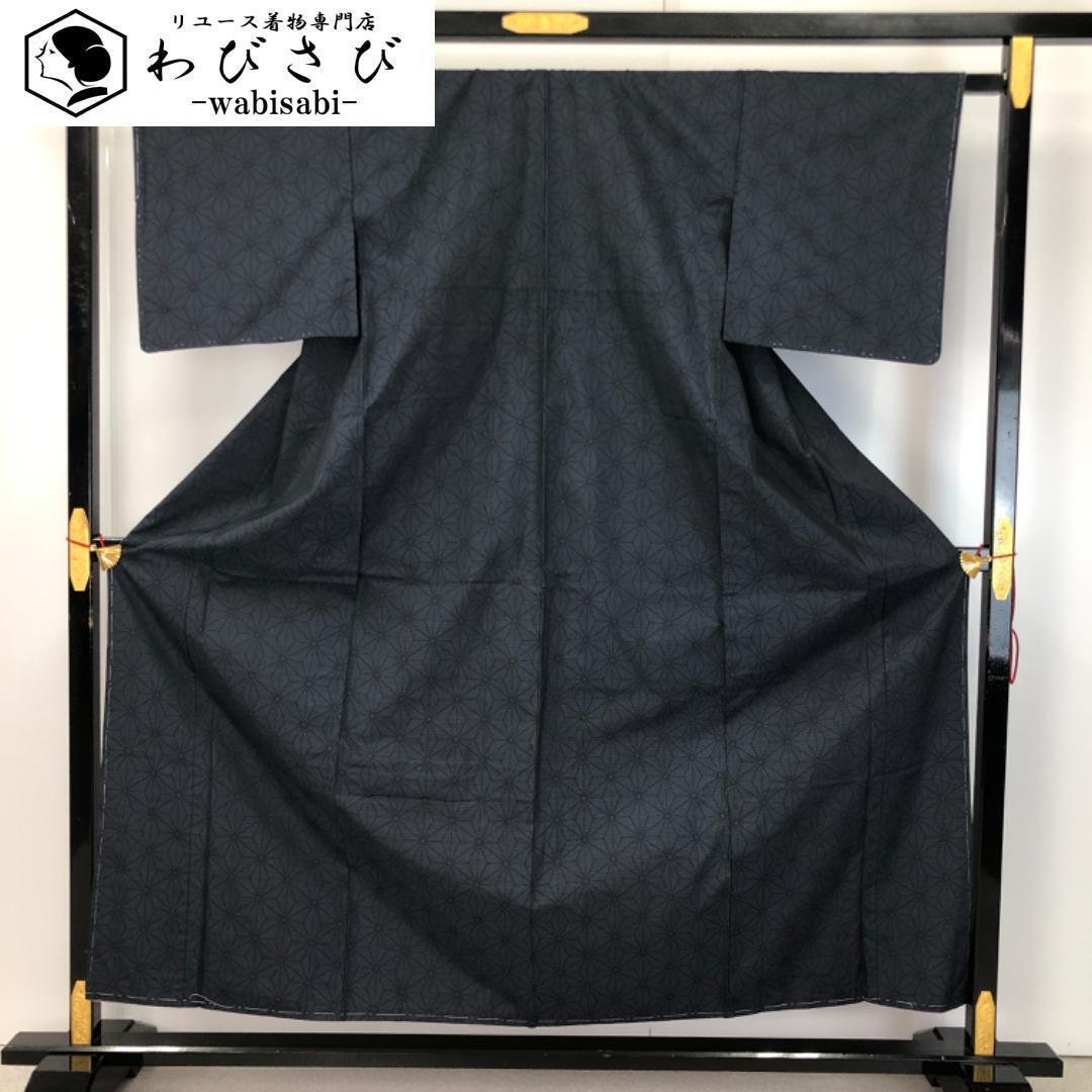 - 本場大島紬 横双絣 麻の葉模様 青褐色 しつけ糸 K-4591 着物 きもの kimono 和服 和装 中古 リサイクル着物 【送料無料】