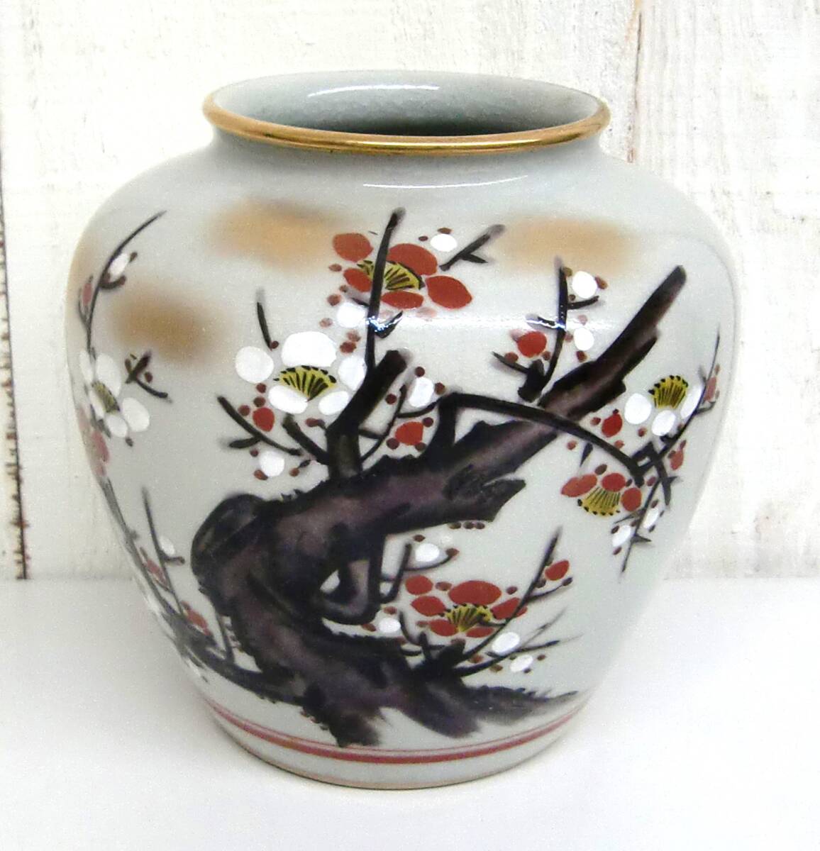 > *伝統工芸 工芸品 工芸美術 *九谷焼 峰山 *花瓶 花入 花生 フラワーベース 飾壷 *紅白梅 *高さ 14cm *共箱 栞付き