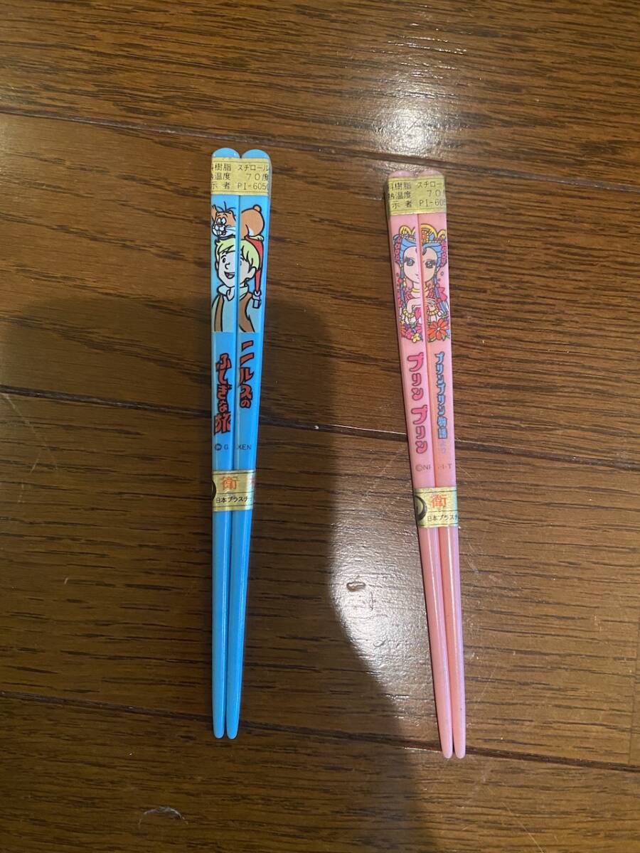 - 当時物 未使用 箸 2個セット 『ニルスのふしぎな旅』『プリンプリン物語』 汚れあり KK4971