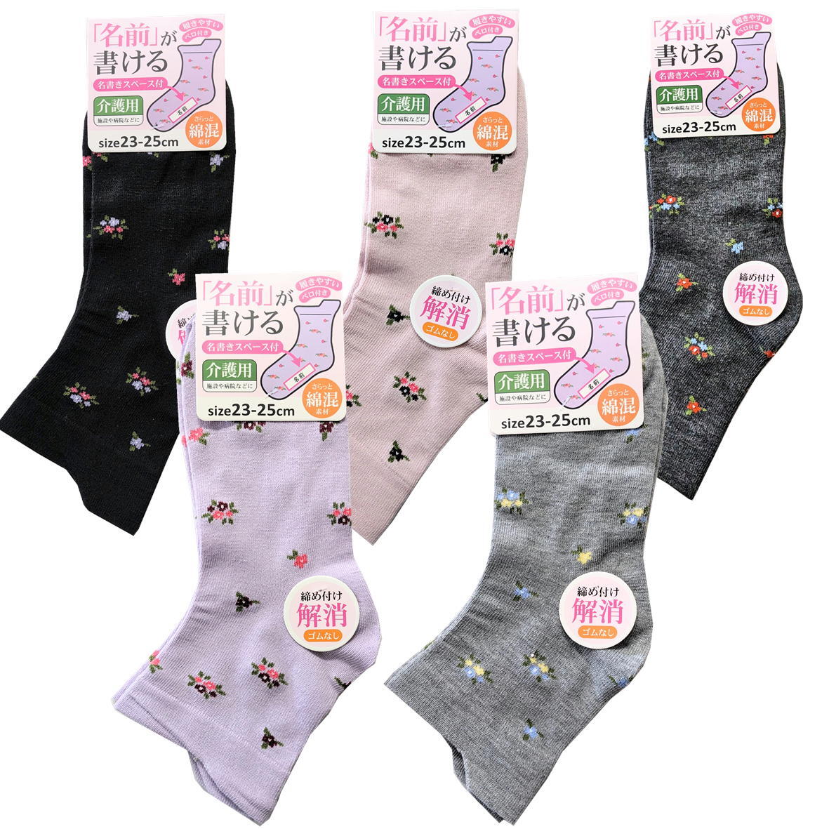 - 新品●送料無料●女性用 名前の書ける 介護用ソックス 締め付けなし 片手で履ける 5足組花柄 23~25cm