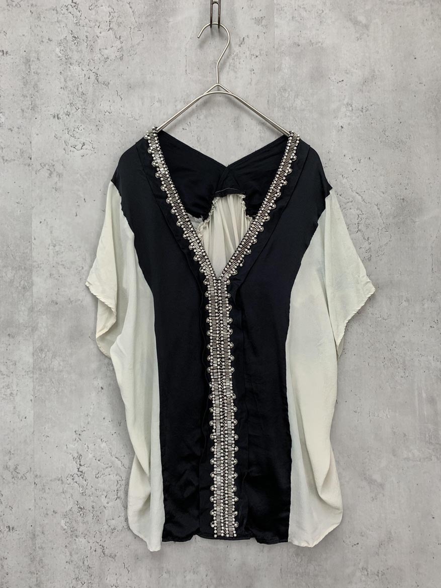 - ゆうパケットOK GRACE CONTINENTAL グレースコンチネンタル シルク100% パール ビジュー Vネック ブラウス シャツ size36 /白x黒 ■◆