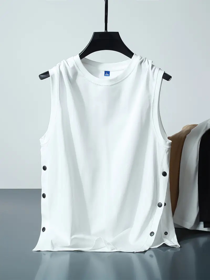- お洒落タンクトップ涼しい男女兼用サイドボタンが黒で記事が白なので良いお出かけ用オススメ人気です重ね着用にもキレイ目で良いと思います