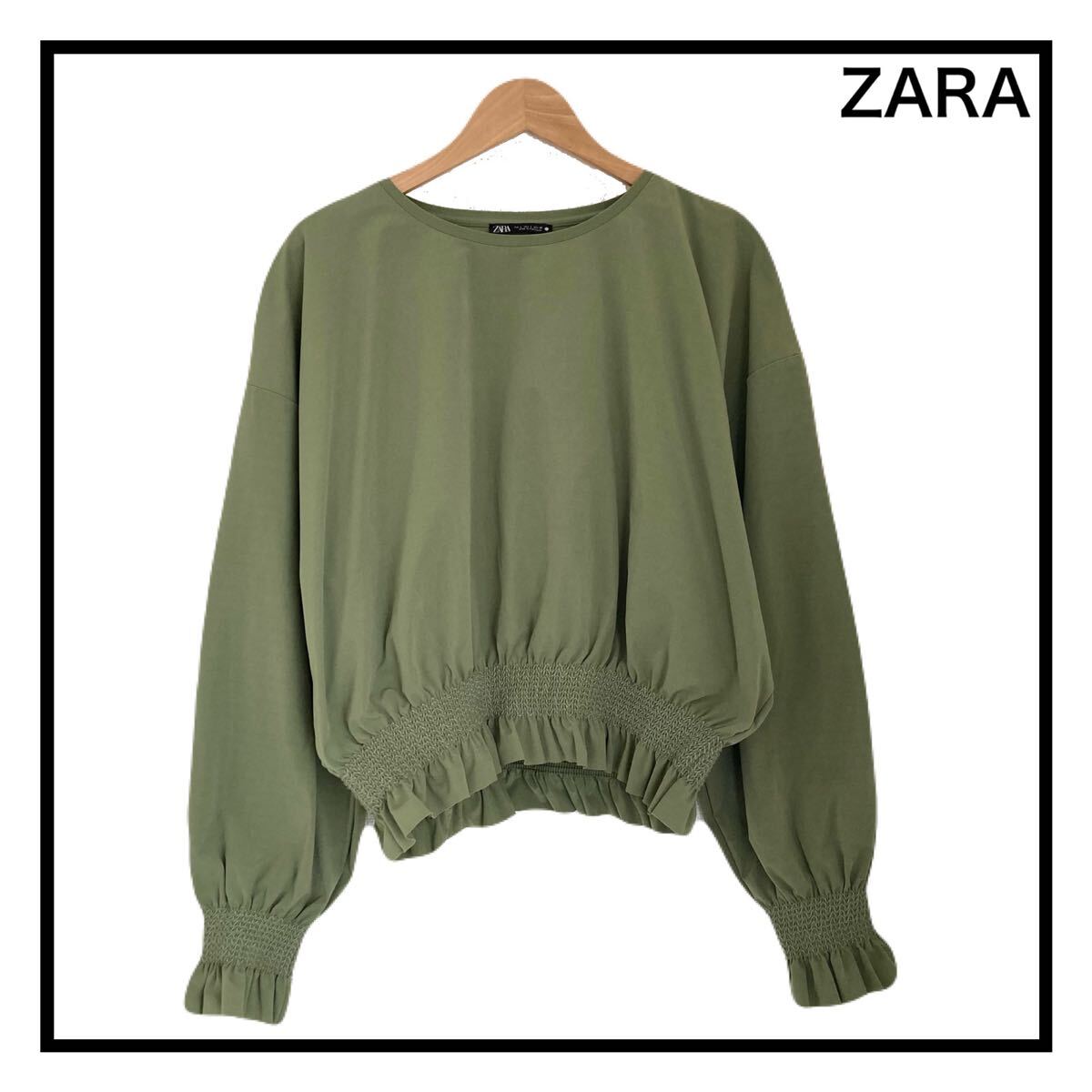 - ザラ ショート丈 ブラウス シャツ 絞り袖 長袖 カーキ ノーカラー レディース