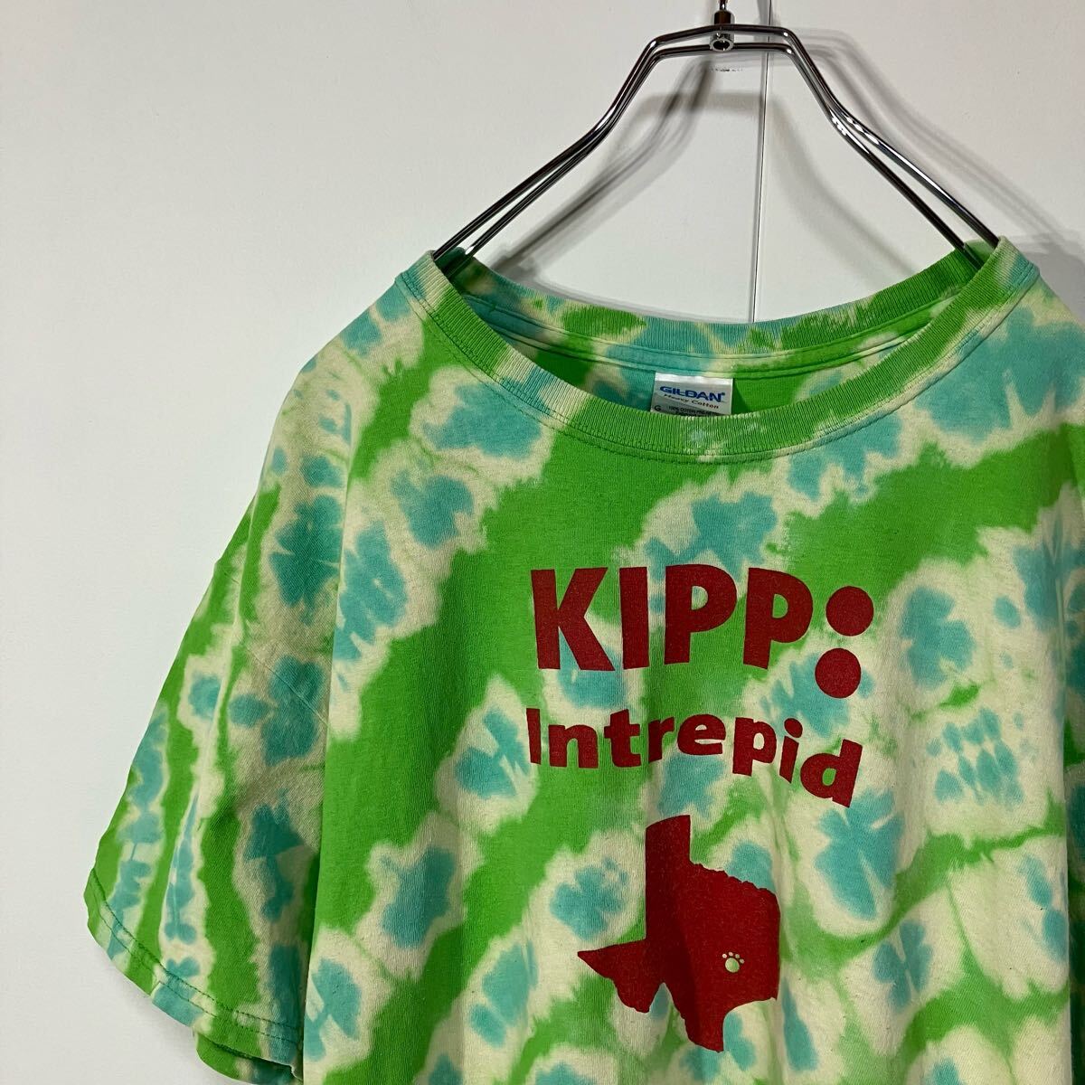 > 古着 プリント アート クルーネック 半袖 Tシャツ 一点物 イエローグリーン クリーム ブルー L