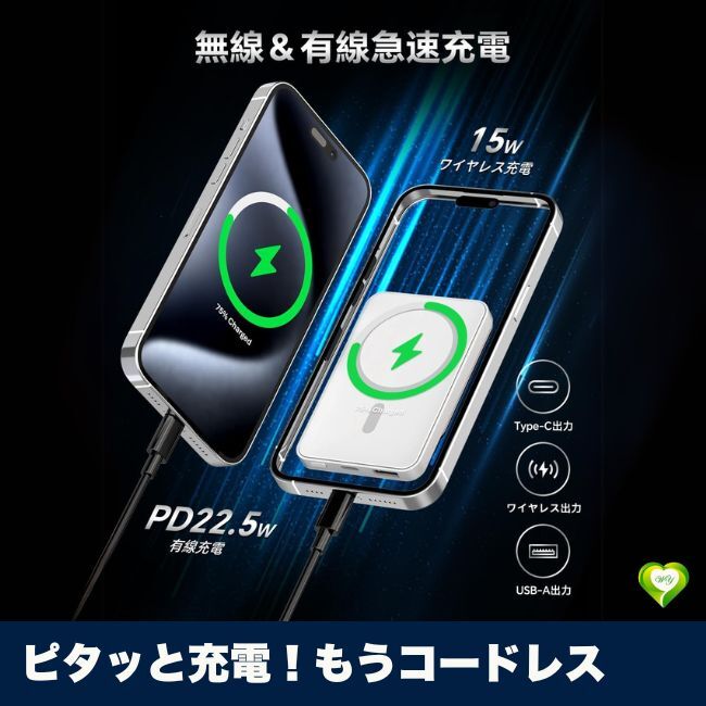 - 【ピタッと充電!もうコードレス】モバイルバッテリー マグネット式 Magsafe対応 ワイヤレス充電 PD急速充電 人気 おすすめ
