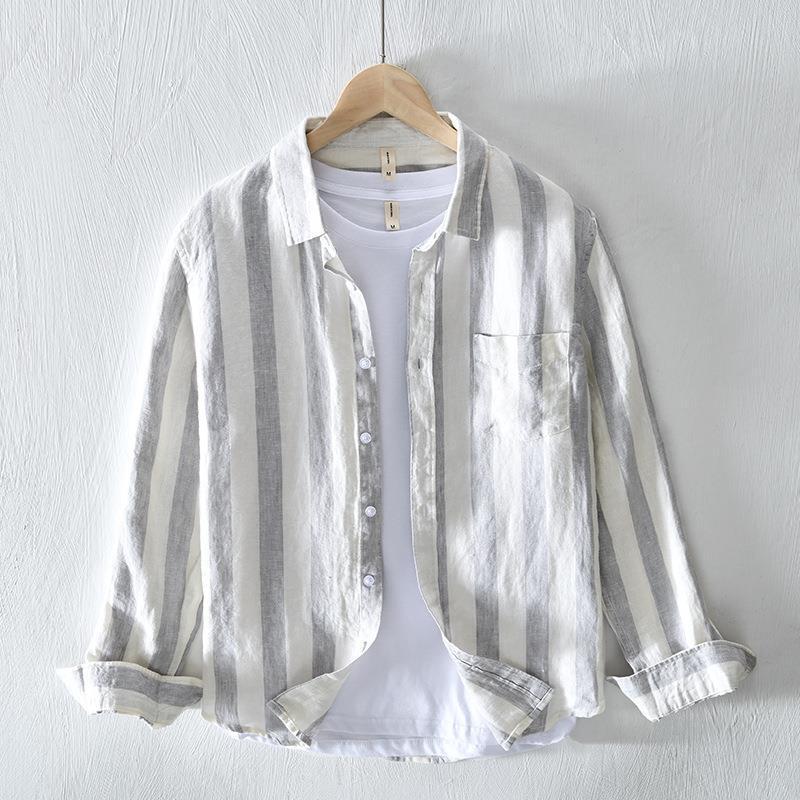 - 新作上質リネンシャツ メンズ カジュアルシャツ 麻 ストライプ柄 長袖 ポケット付き おしゃれ 羽織り 薄手 涼しい グレーXL