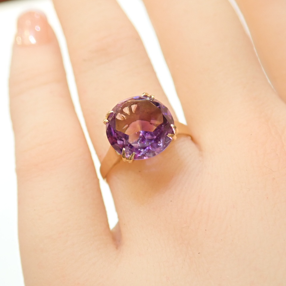 - ■K18 アメシストリング■穴透かし 割り爪■アンティーク 昭和レトロ■指輪■紫水晶クォーツ■中古磨き仕上げ■