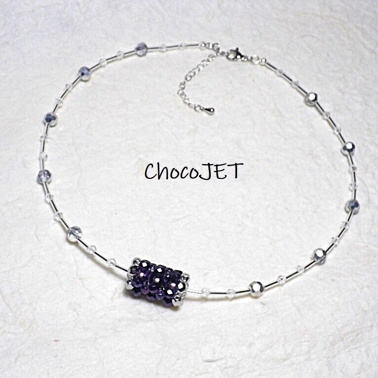 - チェコ・シルバーパープルビーズ・シリンダーネックレス・チョーカー 紫色銀色円柱型