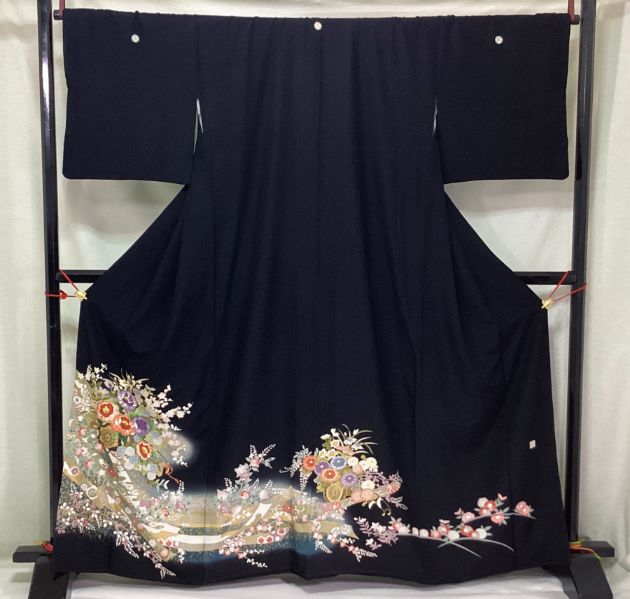 - 中古品 正絹 黒留袖 京友禅金彩加工 ボカシ染 丸に剣片喰 比翼仕立て 身幅LL 25124 t