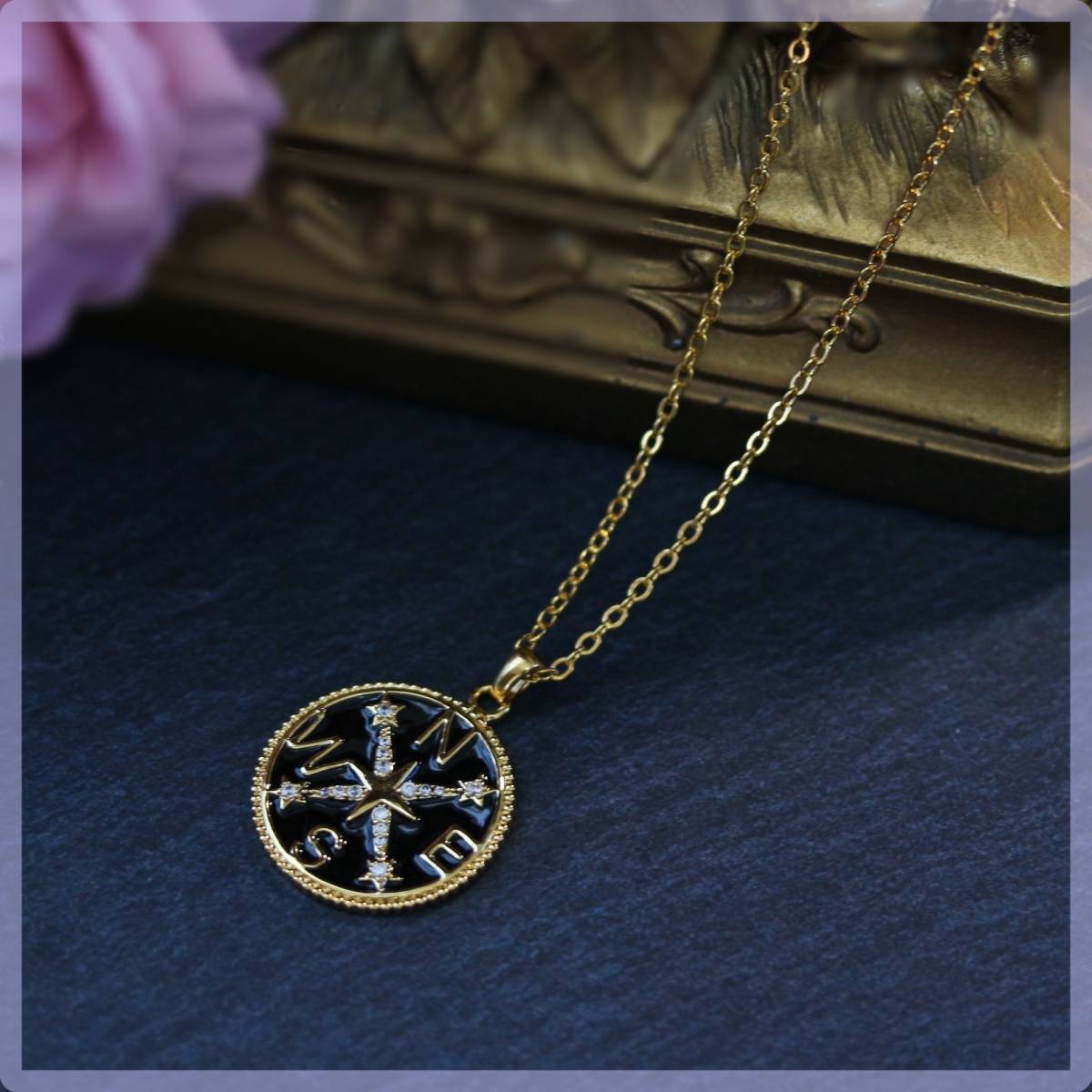 - N7837/コンパスペンダント コイン型 羅針盤 方位 お守り ネックレス 18金加工 金色 ゴールド ロング 60センチ ステンレスチェーン 付