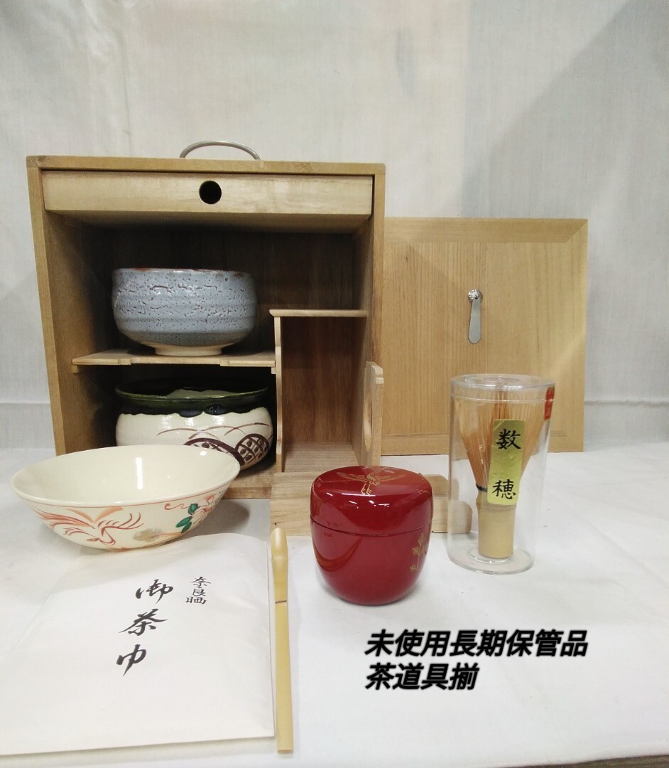 > g_t K178 【茶道具 揃/色紙桐箪笥 /茶碗 2客 建水 茶筌 茶杓 棗 茶巾】購入して使わない儘、保管しておりました。