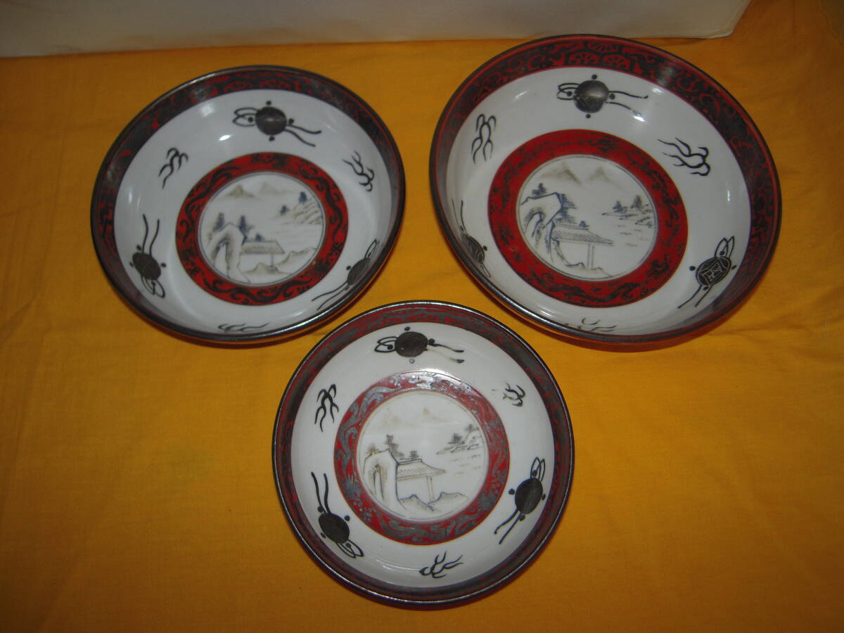 - 旧家所蔵整理品【古い九谷・永楽】 深鉢3枚揃い 赤絵景色絵図 大中小