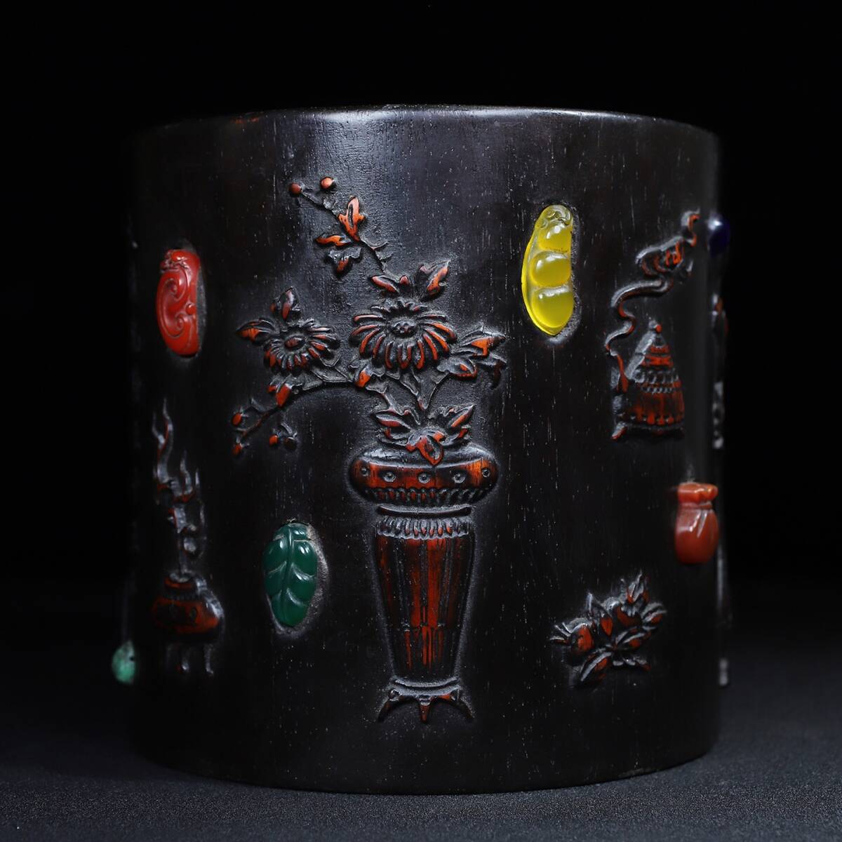 - 【超珍館蔵】花梨木製 細密彫 博古紋 筆筒 置物 賞物 古賞物 古美術品 稀少珍蔵品