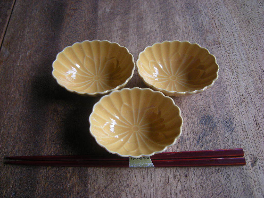- 料亭うつわ◇美濃焼【新品・未使用】黄釉 菊紋 楕円小鉢 醤油・珍味皿(8.3㎝x6.5㎝x3.2㎝)1枚から *料亭うつわ*高級うつわ*