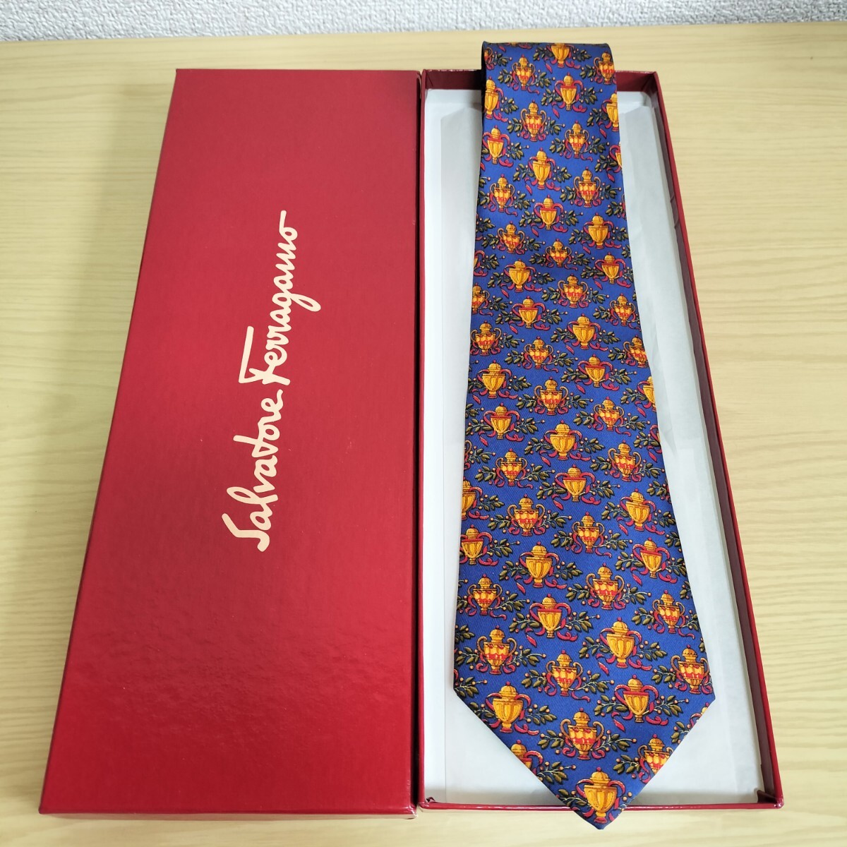 - Salvatore Ferragamo(サルヴァトーレフェラガモ)青ゴールド壺草デザインネクタイ