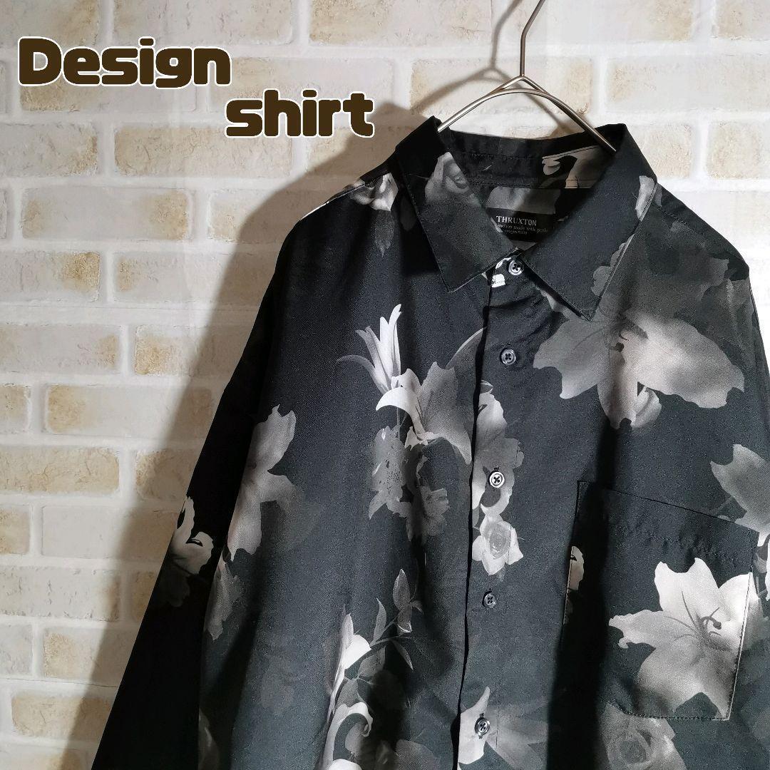 - デザイン シャツ 長袖 総柄 ボタニカル 黒 ポリシャツ