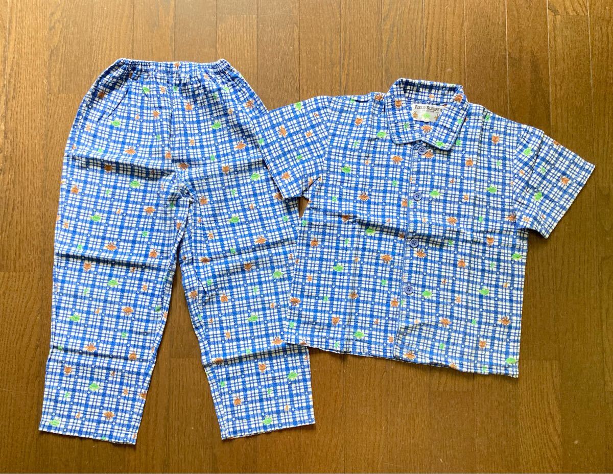 > パジャマ ルームウェア 半袖 長ズボン 前開き チェック カメ カブトムシ 上下セット ブルー系 綿100% キッズ 120
