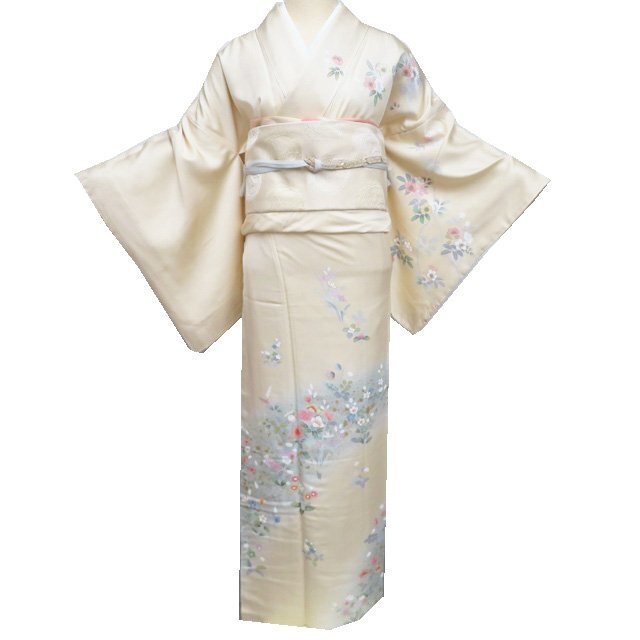 - 訪問着 着物 中古 正絹 袷 フォーマル 花模様 淡黄蘗色 多色 金 身丈167cm 裄69cm L トール きもの北條 A1190-9