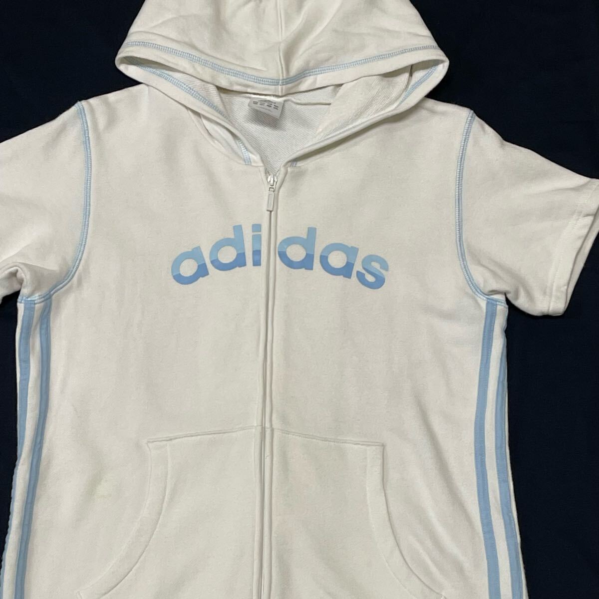 - 00s Y2K adidas フーディー 半袖スウェット Tシャツ パーカー 00年代 アディダス スリーストライプ 3本ライン ビッグロゴ デカロゴ 早5175
