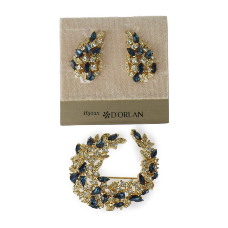 - 美品 D’ORLAN ドーラン イヤリング ブローチ セット メタル ラインストーン ゴールド ブルー系 クリア ヴ【本物保証】