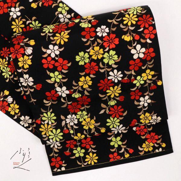 - 【名古屋帯】 彩り揺れる花々模様 黒地 普段着に 正絹着物 レディ―ス NB12-6