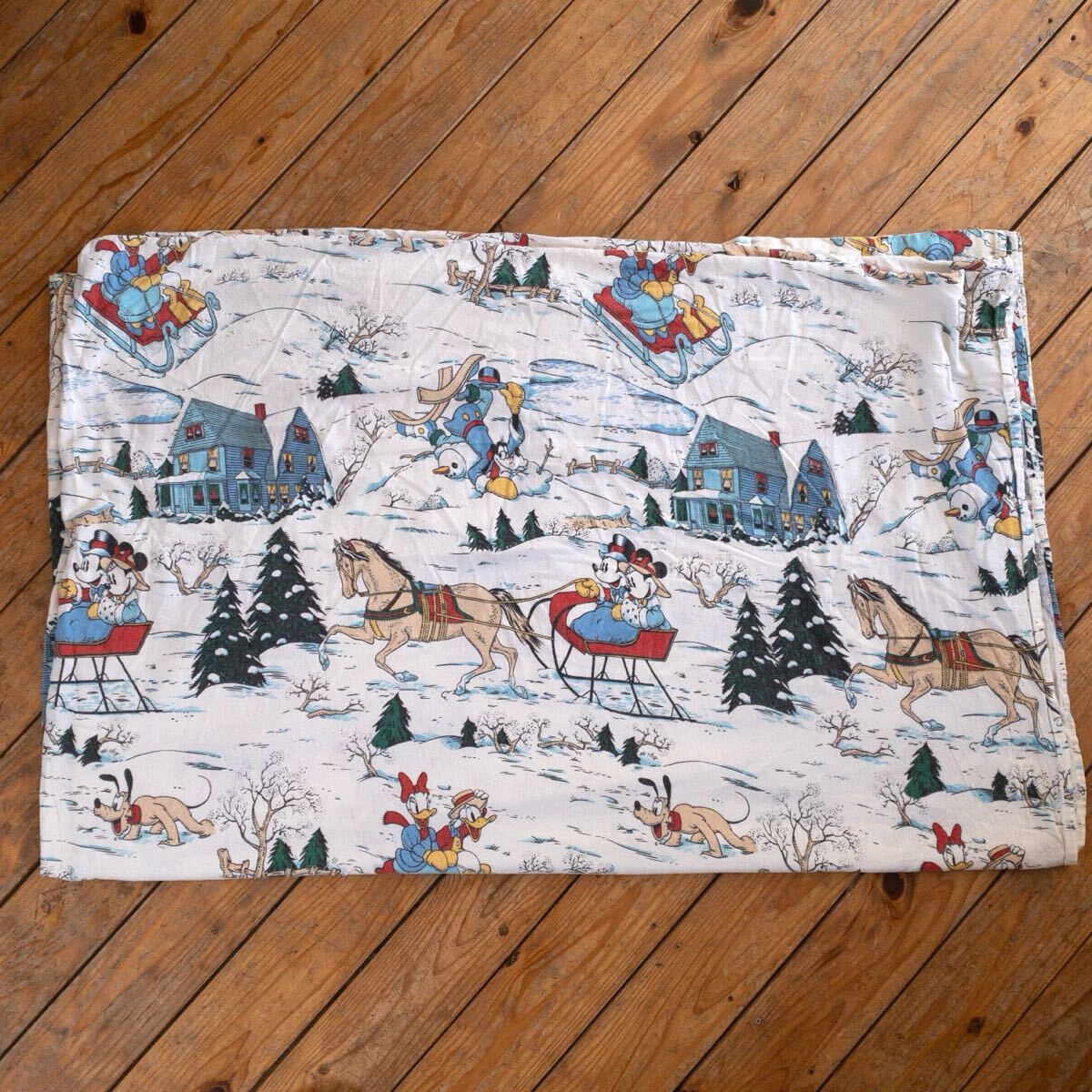 - USAヴィンテージ ベッドシーツ ディズニー リメイク生地 素材 ミッキー 冬 クリスマス ウィンター フラットシーツ アメリカ仕入 B2650