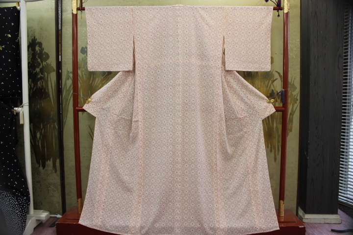 > きもの今昔8497 夏のきもの 広衿セブセ付き単衣小紋 正絹駒絽アイボリー地臙脂色七宝崩れ格子 身丈159cm