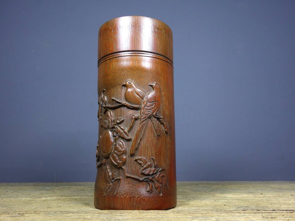 - ▽鴻▽ 竹材細密彫 秋實紋 茶葉筒 置物 賞物 古賞物 中国古玩 中国古美術