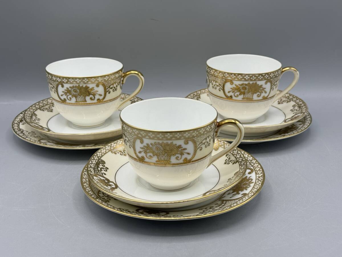 - 里帰り ノリタケ フラワーバスケット 3客 トリオ カップアンドソーサー ケーキ 皿 (-8) プレート 金彩 お花 マルキ印 カップ&ソーサー