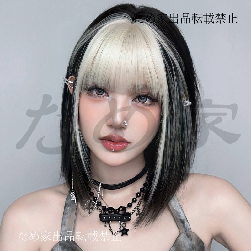 - 新品人毛 ショートストレート 銀白グレー インナーカラー前髪 つむじ部分手植え 自然に見えますフルウィッグ
