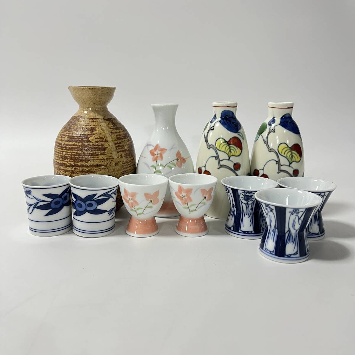 - 【61771V】徳利 盃 お猪口 まとめて 11点 陶器 ぐいみ 染付 酒瓶 花柄 経年保管品 現状品