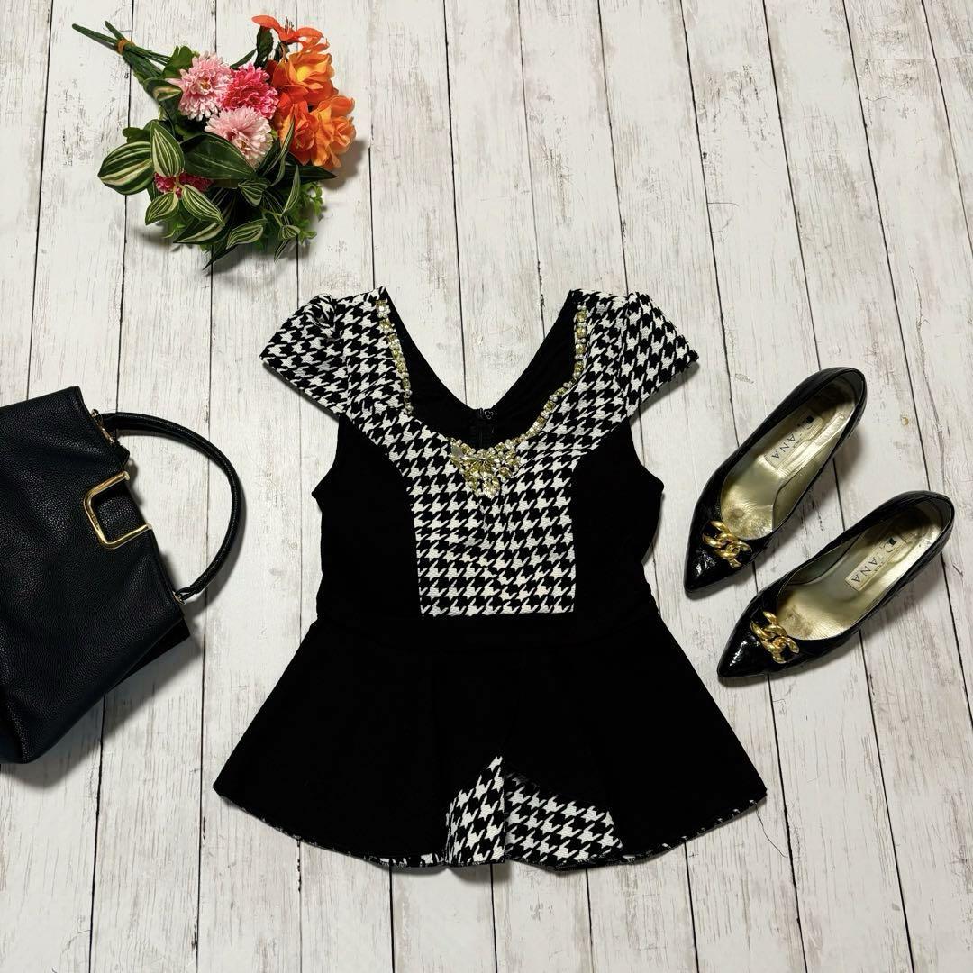 - 千鳥柄 へプラムトップス 黒 白 千鳥格子 ビジュー バックジップ