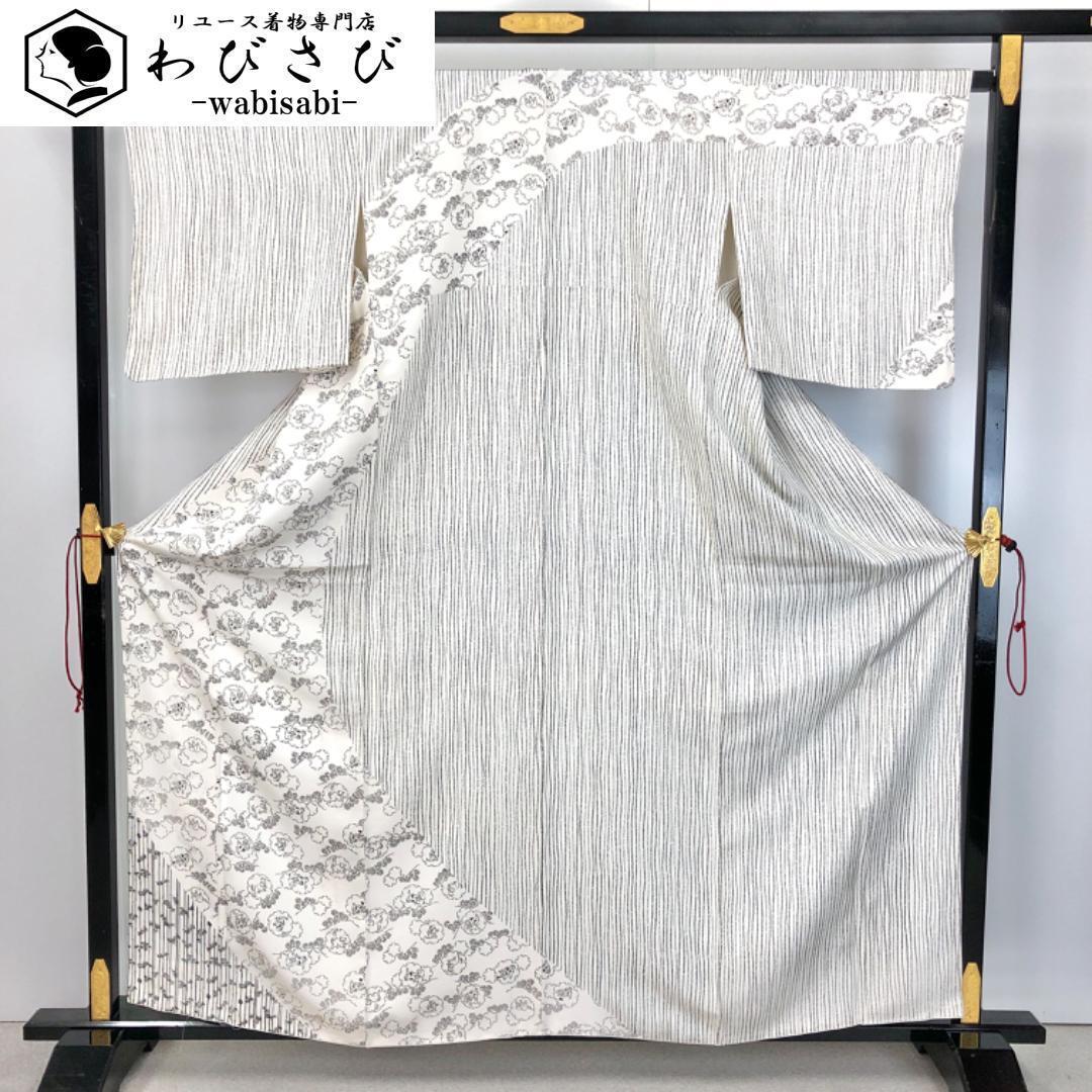 - 訪問着 縦縞模様 雪輪に動物柄 竹模様 乳白色 ガード加工 K-4792 着物 きもの kimono 和服 和装 中古 リサイクル着物 【送料無料】