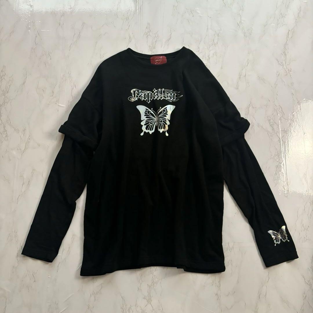 - 【エーエヌケー】 バタフライプリントプルオーバー 【M】 黒 オーバーシルエット