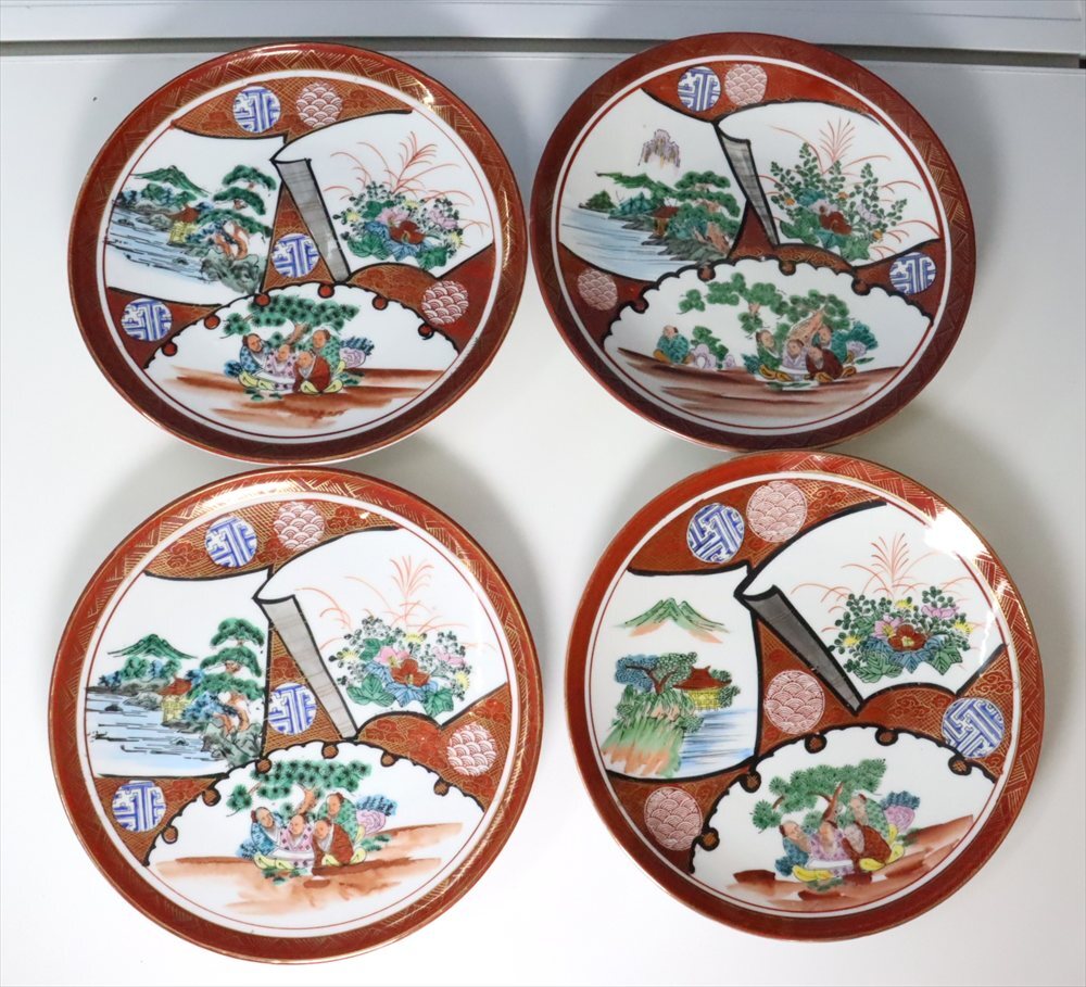 - 【No1366蔵出し】 『 九谷 庄三 赤絵 絵皿 九谷焼 プレート 4枚セット 直径約21.9cm 骨董品 アンティーク』