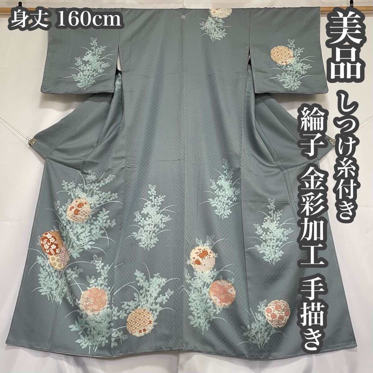 > #H056 美品 しつけ糸付き 訪問着 綸子 金彩加工 手描き 雪輪 草花 正絹 身丈160cm 刺繍紋 和服 和装 着物【wellriver】