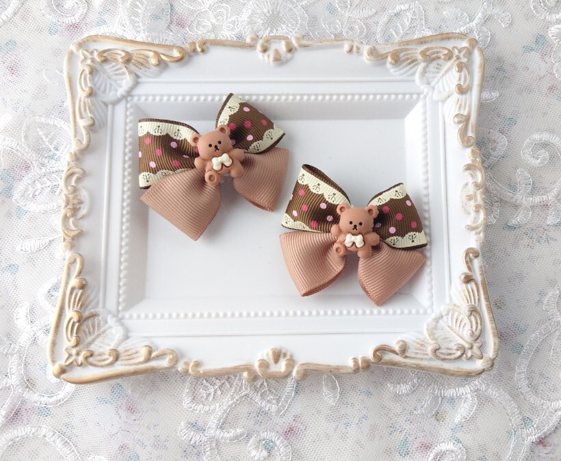 - *幼SD~SD等 1/6~1/3サイズ ドール用 ヘアクリップ ヘアアクセサリー ヘアリボン 2点セット*【Chocolate Bear】