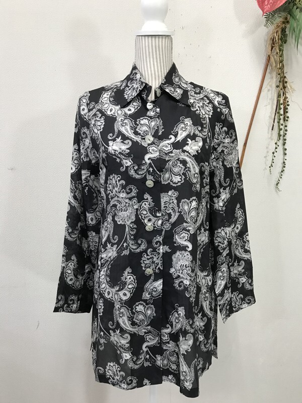 - 3907 レディース 【 LAPINE BLANCHE 】 SILK100% 長袖シャツ サイドスリット入り サイズ:38 色:ブラック柄入り