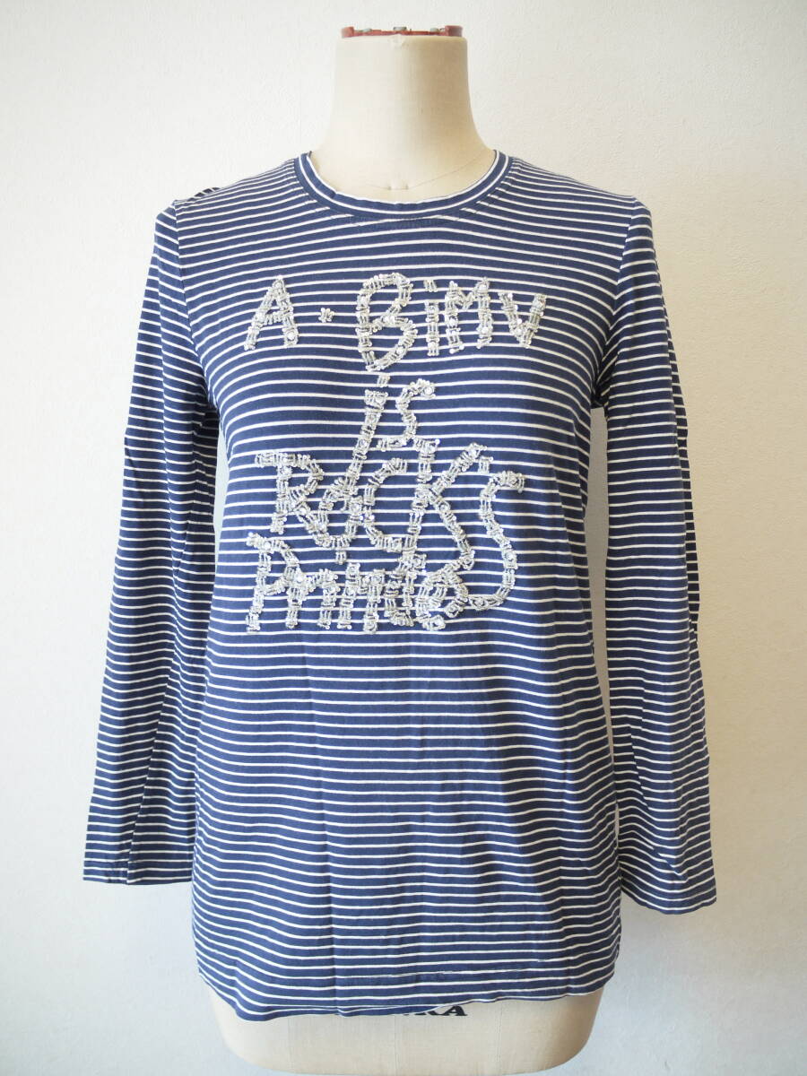 - A・BIMV アビム ボーダー柄 ロゴビーズ刺繍カットソー ネイビー×白 9 美品