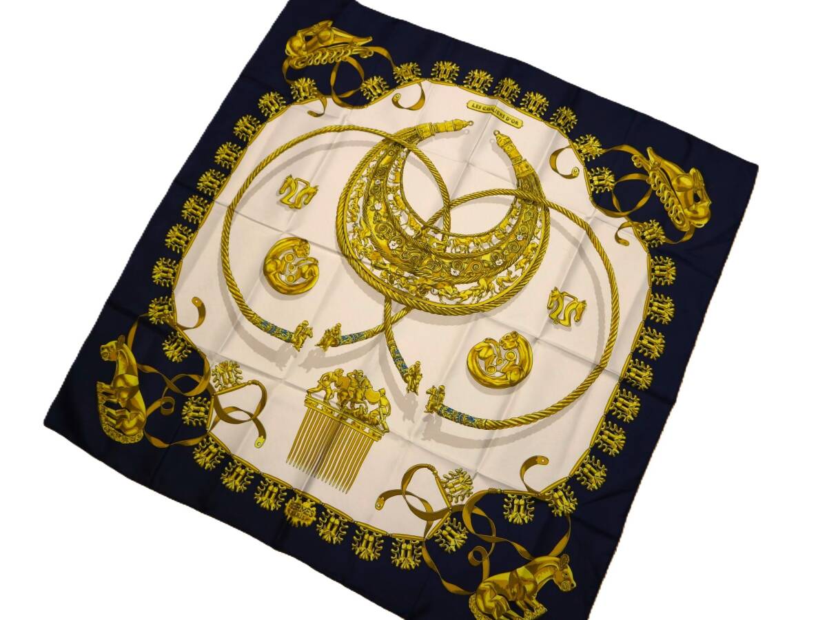 - 【即決】未使用 国内正規 エルメス HERMES◆スカーフ カレ90 LES CAVALIERS D'OR 黄金の騎士 ネイビー/オフホワイト/ゴールド 89×90 ta