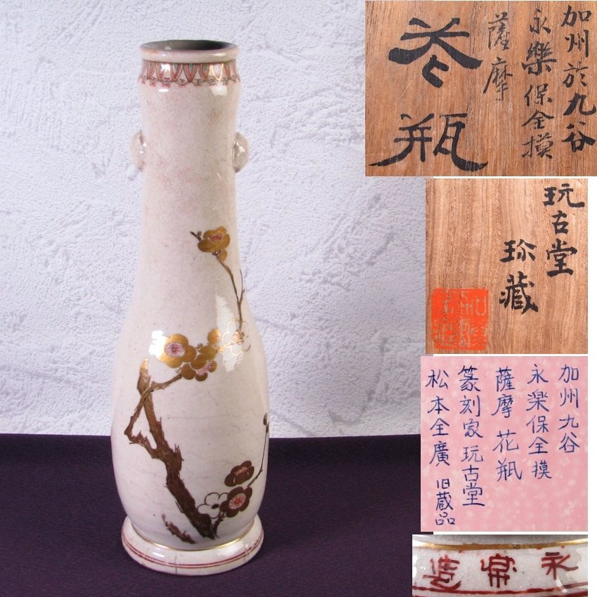 - 加州九谷 永楽保全模 薩摩花瓶 玩古堂 松本全廣旧蔵品 高さ:36cm 共箱 江戸末期/25c014